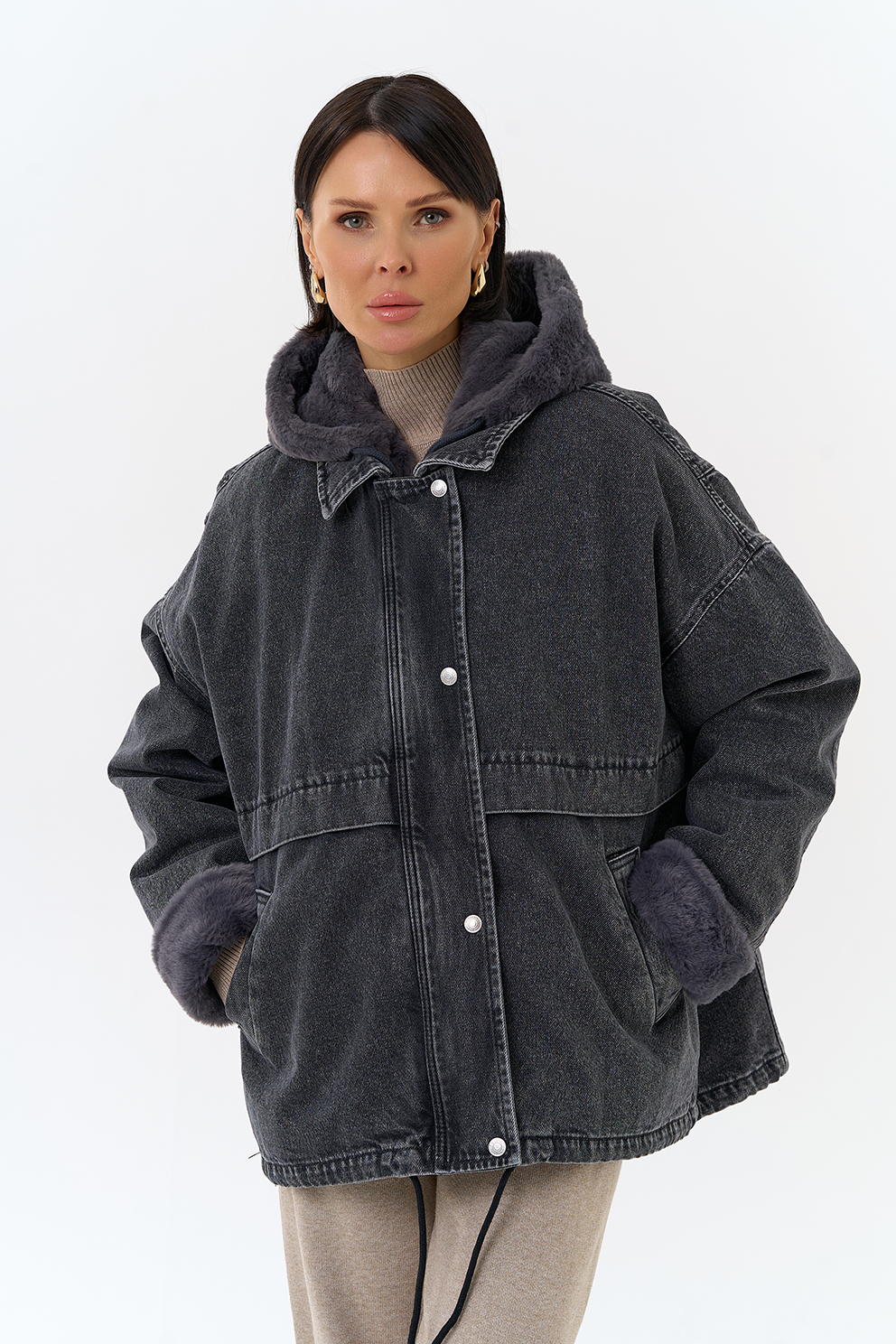 Крой воротника - съемный капюшон, отделка эко мех