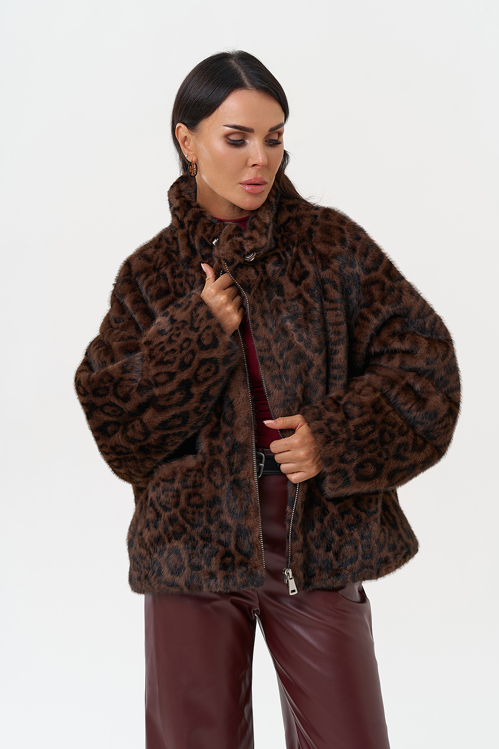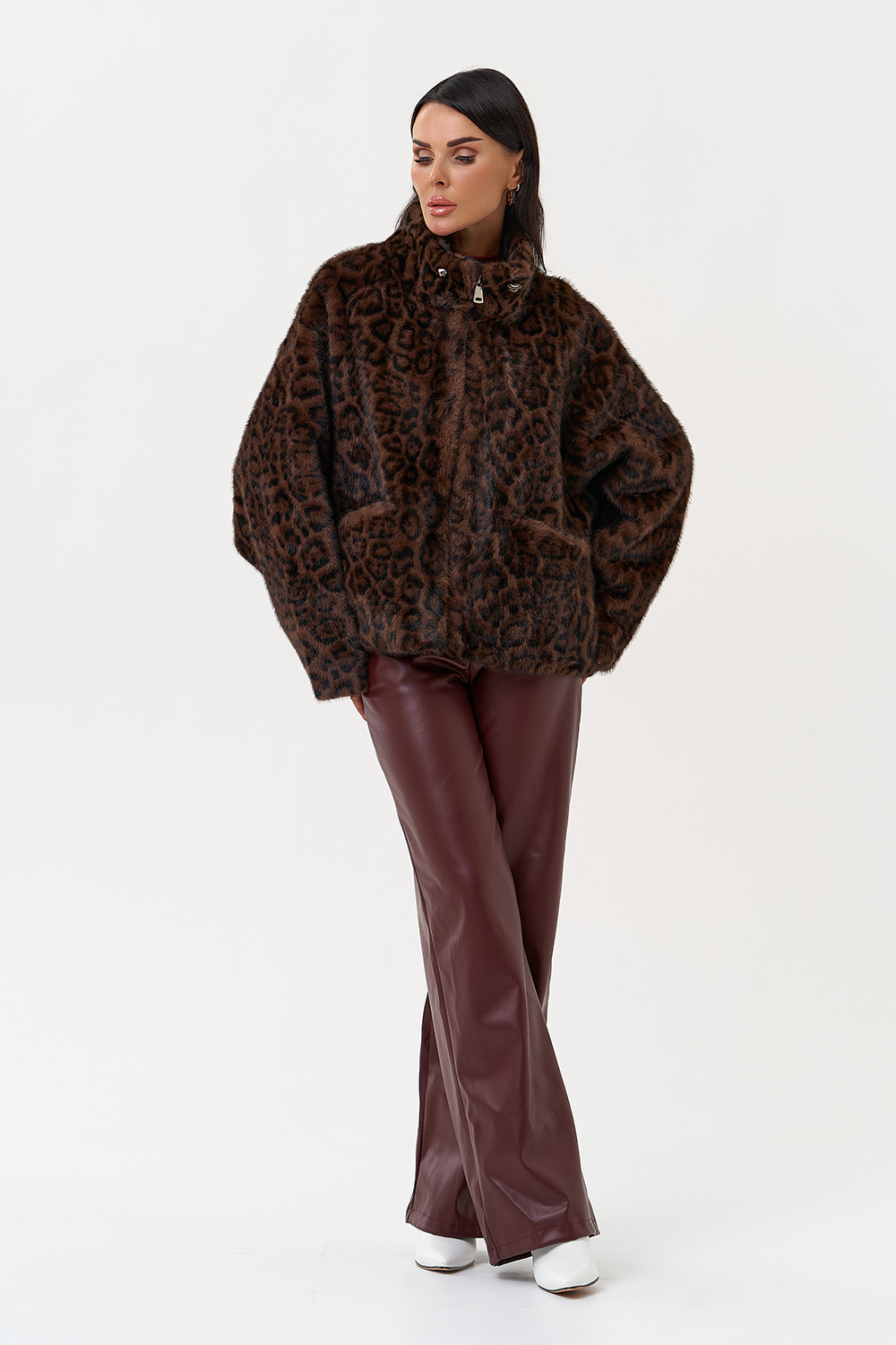 Фасон - прямой Длина изделия - 65 см Цвет - коричневый Принт - леопард Материал - экомех Состав полотна - полиэстер 100% Подкладка - полиэстер 100% Вид застежки - молния Вид ворота - стойка Фасон рукава - реглан, длинный |